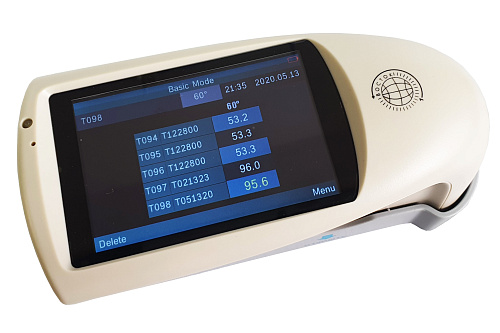 Прибор измеряет блеск на плоских поверхностях с возможностью зарядки питания и управления прибором с компьютера в режиме реального времени: проведение замеров, экспорт и печать данных через USB-кабель и программное обеспечение. ПО позволяет производить вычисление статистики из серии измерений: max и min значения, среднее значение, среднеквадратическое отклонение (σ), величину отклонения и диапазон разброса/отклонения значений от выбранного эталона. Большой цветной сенсорный дисплей 3,5”, который позволяет отображать одновременно 5 последних результатов замеров (легко сравнивать), а также входить в меню прибора и управлять им. Режимы замеров: базовый (моментальный в одной точке) – только 1 режим доступен на дисплее прибора, а также на дисплее ПК при управлении прибором доступны 2 других режима: статистический режим (с вычислением статистики из серии измерений: max и min значения, среднее значение, среднеквадратическое отклонение (σ) и др. параметры) и режим контроля качества (с установкой нижней и верхней границ допустимого диапазона измерений блеска). Поставляется в комплекте с защитной крышкой-держателем, которая используется для хранения и калибровки блескомера на закреплённой в держателе мере блеска. В крышку-держатель встроена одинарная мера блеска (чёрное полированное стекло). Калибровка осуществляется внутри крышки-держателя автоматически по нажатию кнопки на приборе. Самостоятельная калибровка блескомера пользователем возможна на мере блеска из комплектации прибора или любой другой, в т. ч. от других изготовителей. Прибор изготавливается в пластиковом корпусе со встроенным литиевым аккумулятором.