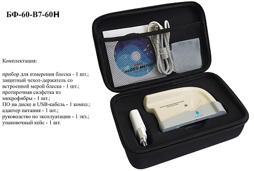 Блескомер модификации БФ-60-В7-60Н предназначен для измерений блеска в геометрии освещения/наблюдения 60°/60°. Размер измеряемого участка не более 9x15 мм (эллипс). Встроенное программное обеспечение осуществляет калибровку показаний по установочной (настроечной) мере блеска поверхности (вмонтирована внутрь крышки защитного чехла-держателя). Встроенное ПО осуществляет хранение до 1000 результатов измерений, обеспечивает возможность передачи и работы с данными на внешнем ПК. Результаты измерений, а также заданные режимы работы выводятся на цветной сенсорный жидкокристаллический дисплей 74x49 мм.