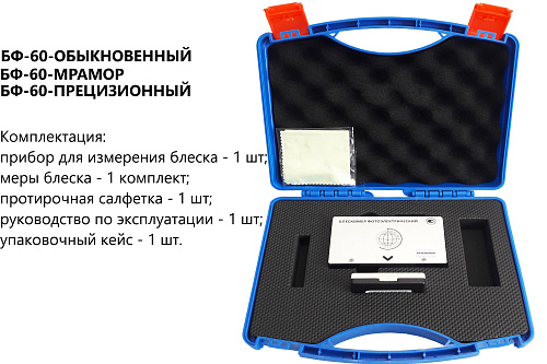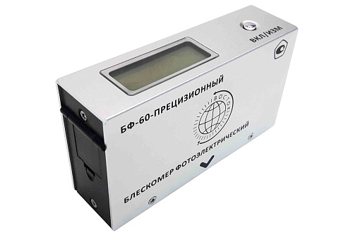 Блескомер модификации БФ-60-ПРЕЦИЗИОННЫЙ предназначен для измерений блеска в геометрии освещения/наблюдения 60°/60°. Размер измеряемого участка не более 14x28мм (эллипс). Калибровка показаний по установочной (настроечной) мере блеска поверхности производится вращением соответствующего регулятора. Результаты измерений, а также заданные режимы работы выводятся на жидкокристаллический дисплей 44x16 мм, хранение до 1000 результатов измерений, обеспечивает возможность передачи и работы с данными на внешнем ПК.