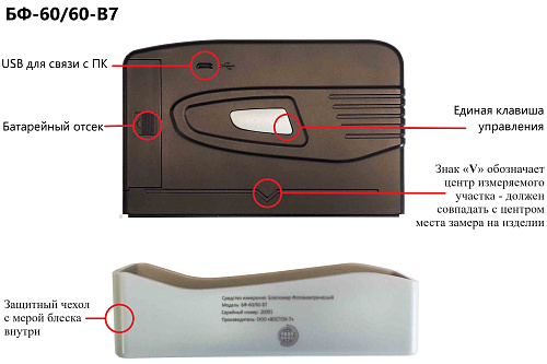 Блескомер модификации БФ-60/60-В7 предназначен для измерений блеска в геометрии освещения/наблюдения 60°/60°. Размер измеряемого участка не более 8x16 мм (эллипс). Встроенное программное обеспечение осуществляет калибровку показаний по установочной (настроечной) мере блеска поверхности (вмонтирована внутрь крышки защитного чехла-держателя), хранение до 1245 результатов измерений, обеспечивает возможность передачи и работы с данными на внешнем ПК. Результаты измерений, а также заданные режимы работы выводятся на жидкокристаллический дисплей 47x19 мм.