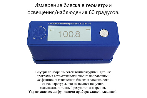 Блескомер модификации БФ-60-В7-192 предназначен для измерений блеска в геометрии освещения/наблюдения 60°/60°. Размер измеряемого участка не более 9x15 мм (эллипс). Встроенное программное обеспечение осуществляет калибровку показаний по установочной (настроечной) мере блеска поверхности (вмонтирована внутрь крышки защитного чехла-держателя), обеспечивает возможность передачи и работы с данными на внешнем ПК. Результаты измерений, а также заданные режимы работы выводятся на жидкокристаллический дисплей 47x19 мм.